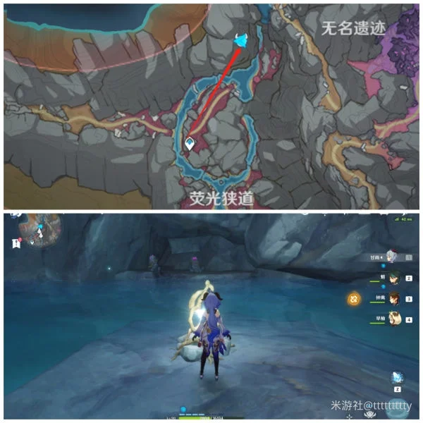 7.传送至临时主矿道左侧的传送点,滑翔至对面的平台上,使用流明石净化前方的淤泥,即可获得一个普通的宝箱。