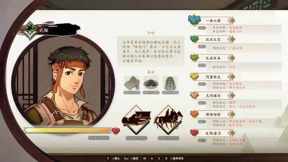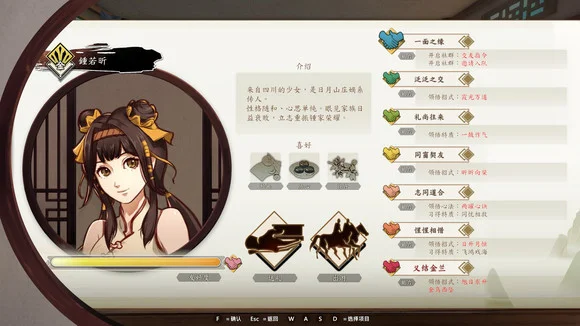 第三年四周目通关,目前没有找到无闲逛光靠送礼全好感满阶的办法,等之后完整资料库出来看看怎么安排参战情况平衡友好度。目前尚未尝试10月上旬之后修不同阵营队友的友好度,理论上应该是事件关闭的,当然没关闭也没时间修。10月之后要干的事情还是挺多的,最大限度全传书的话(高级武功修业只做一个,武器同理,不做挥拳传书,欣赏只做阁主段二选一以及主业老师的,是的,练道恒的都来不及做,道恒欣赏成就需要把前三个打杂传书完成后额外打杂九次外加三个传书),10月下旬到12月下旬需要修炼满高阶武功的三招,还有逍遥劲外加锻炼撑属性,没个2100的四维进最终战底气不足。所以测试过程中采用的好友阶段安排如下: