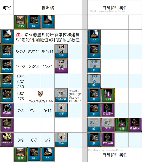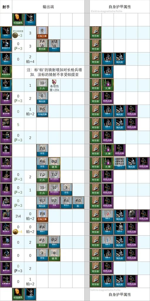 首先长戟兵对[骑兵]护甲属性具有32点加成,对[战象]护甲属性具有28点加成,对[船]护甲属性具有16点加成(征服者版本)