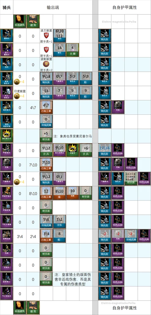 精锐甲胄骑兵具有[骑兵]属性+16附加护甲,还有[特色兵种]护甲属性。