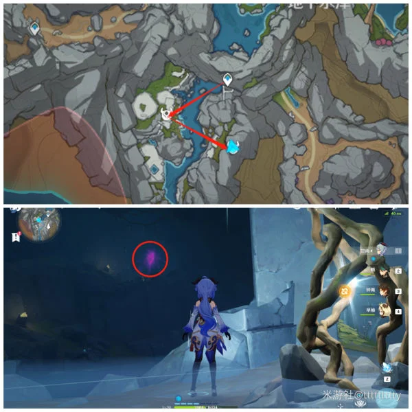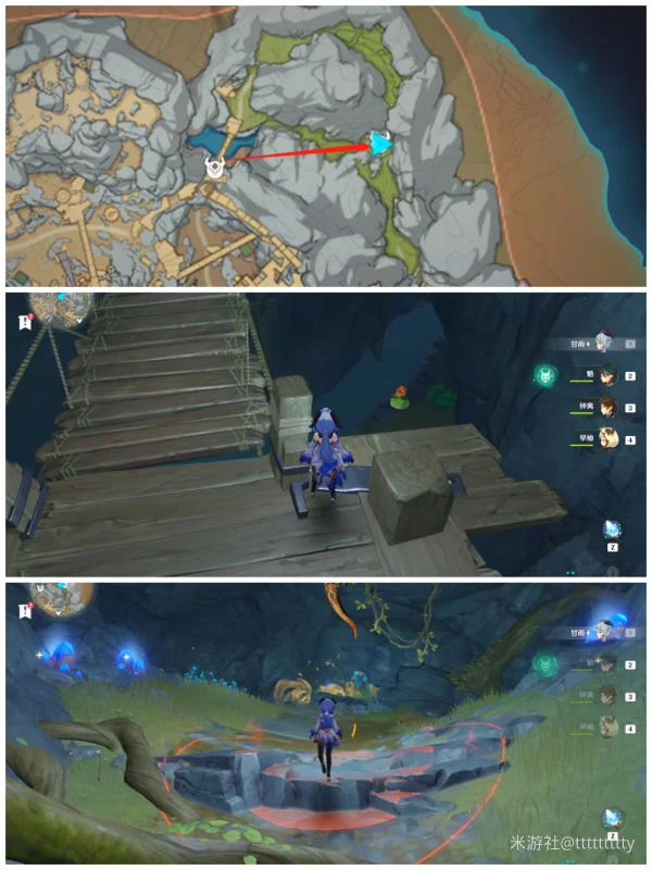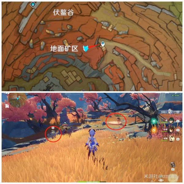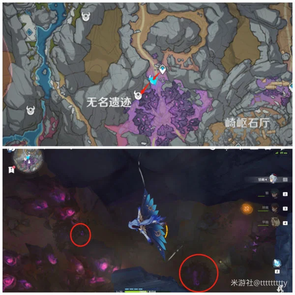 25.回到传送点,向着左前方滑翔,此处是一个枯木宝箱,四个紫石位置以下图甘雨为基准,左侧一个,后方两个,前方一个。
