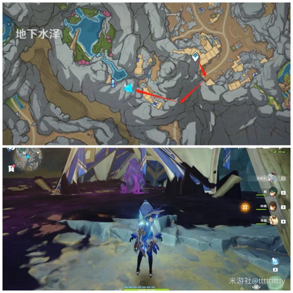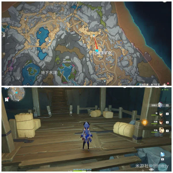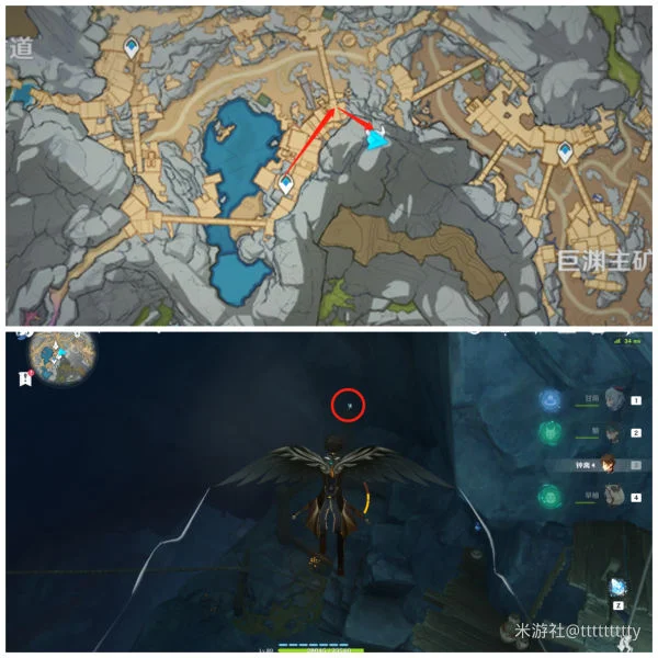 15.传送至巨渊主矿区上方传送点,后转身向前方滑翔至下图所示淤泥处,接着降落下来即可。