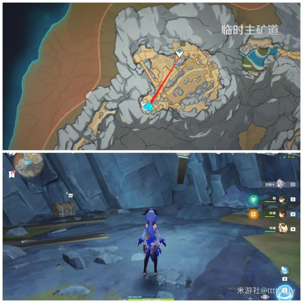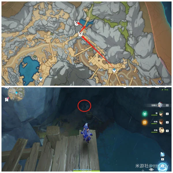 5.传送至地面矿区右侧传送点,爬上左侧的山崖,如下图所示,上面有一只丘丘人在压力板上跳舞,这里我们可以直接拾取左侧的宝箱。
