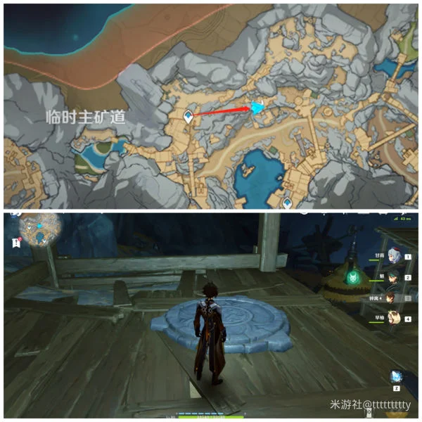 4.传送至天工峡右侧传送点,后转身跨过木桥,来到下图所示圆盘处,将钟离或岩主的岩造物立在上面,然后在岩造物持续时间结束之前,将这些发光的小颗粒收集齐即可。