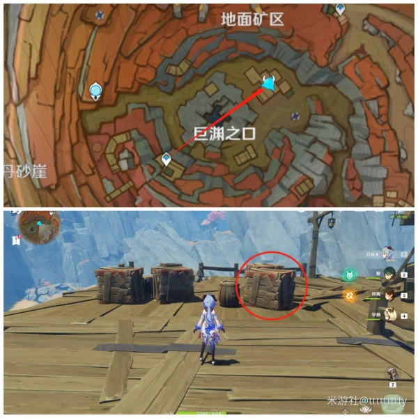 19.回到巨渊主矿区上方传送点,朝着前方滑翔至下图所示位置,将面前的五个草垛清除即可获得宝箱。