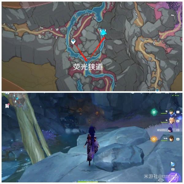 31.传送至荧光狭道上方传送点,右转直行至下图所示位置,此处是一个枯木宝箱。四个紫石位置以下图角色为基准,前方两个,右侧一个,后方一个。