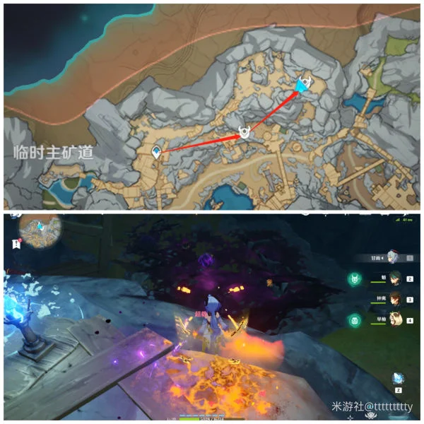 9.回到临时主矿道右侧传送点,右转向前方滑翔至下一层,首先对面前的枯木进行充能,四周会出现四个紫石。这里有两种方法。