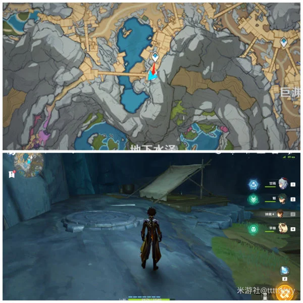 33.传送至巨渊主矿区下方传送点,右转跳至下方,从进入下方山洞后直行,土路右侧会有一条通道,右转沿着通道直行至下图帐篷处,净化淤泥即可获得宝箱。