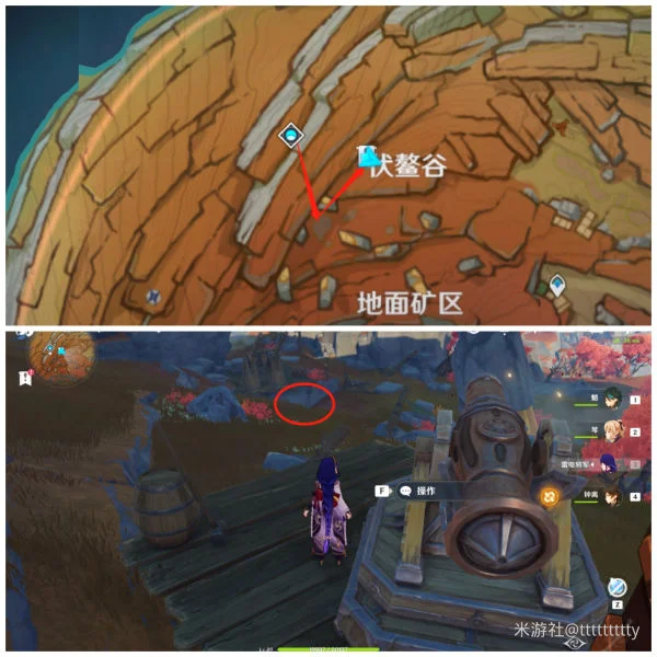 6.传送至伏鳌谷左侧秘境处,后转走出山洞,接着爬上左侧山崖,去操作上方的炮台,向左转3下,向下转1下,开炮后便可将下图圈注处轰开,接着跳下去就可以获得一个珍贵宝箱。