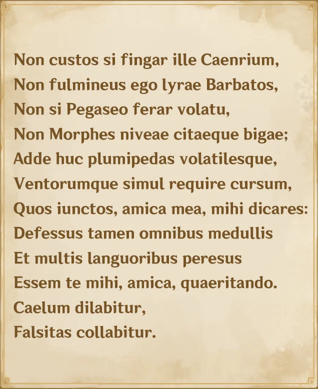 知道这个背景咱们再来看,58b的这前七句是不是都是在说一件事,那就是“急”,换句话说,就是在堆叠加速buff,看原神这一版也是这样,前两行虽然疑似说了遗迹守卫和巴巴托斯,但是这里很可能只是在比喻自己在找谁的迫切的心情。前面幻想自己是各种迅捷的事物,而第八句开始转折,说,即使我有前面这么多加速buff,我找你找得也很艰辛。原神里这首和原诗不一样的地方是,原诗找的卡梅里乌斯是一位男性(amicus),但是原神这里都改成了女性(amica),所有很可能作者是在寻找一位女性朋友。