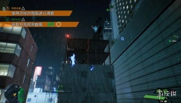 爬上工地最高处,瞄准对面大楼的天狗,空格爬上去。