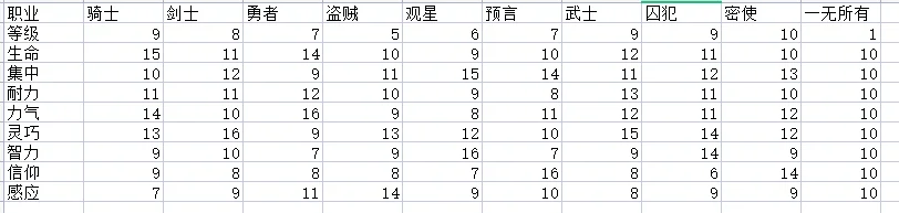 上面这个表格为所有职业的初始属性,可以看到初始属性最低的职业为勇者和预言家,都为7点