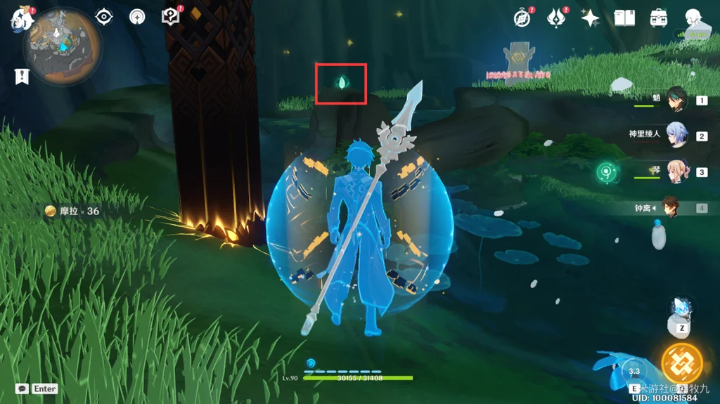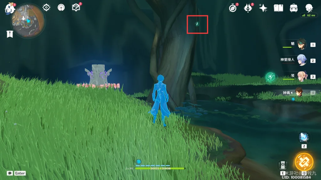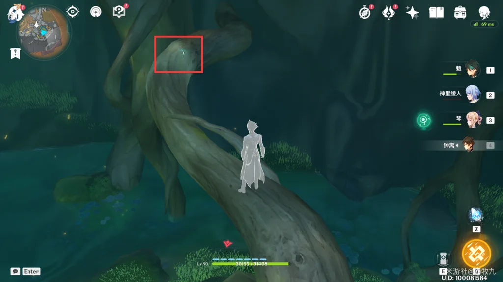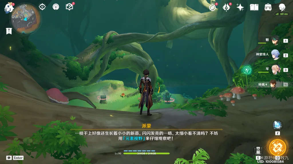 通过派蒙的提醒,旅行者可以开启元素视野找树干上的新苗。