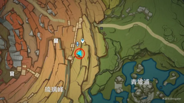 第6处推荐在拾取第5处老石之后按照图中的标记去获取,也可以从天工峡的东南方向通过跳台来到此处