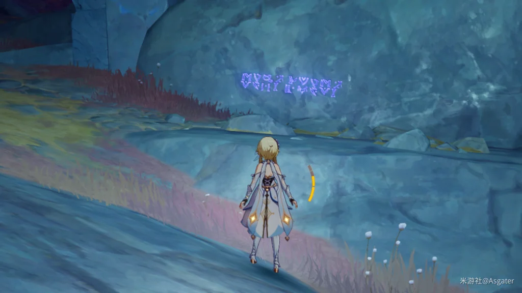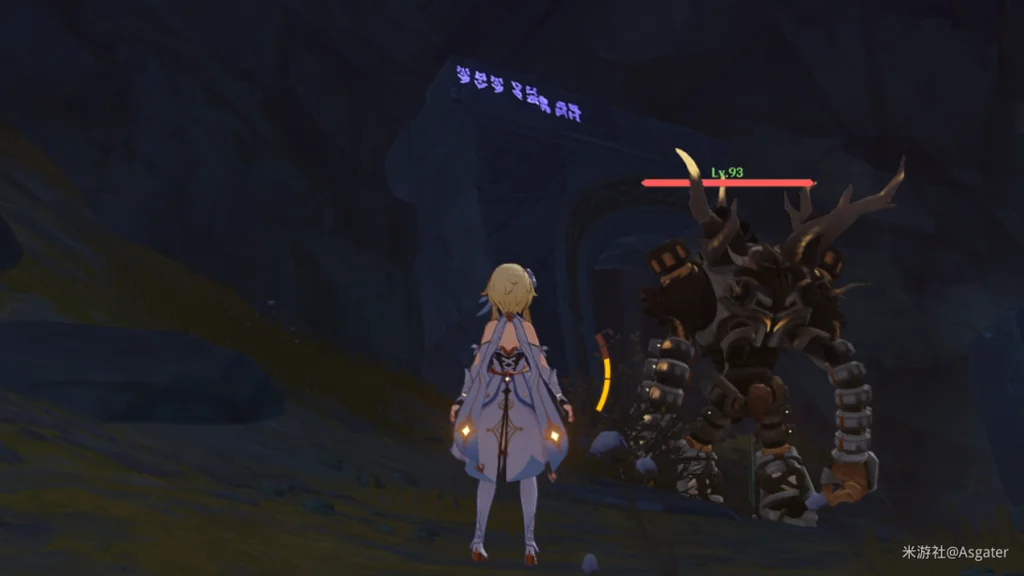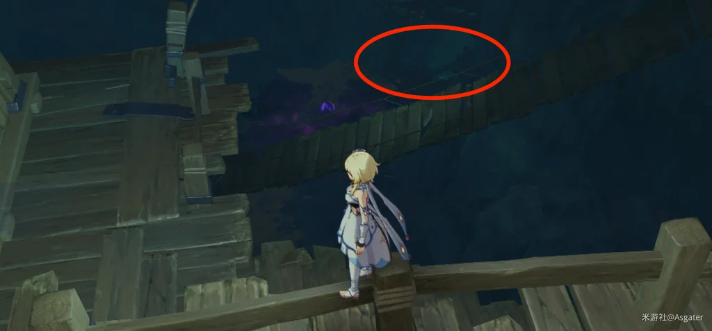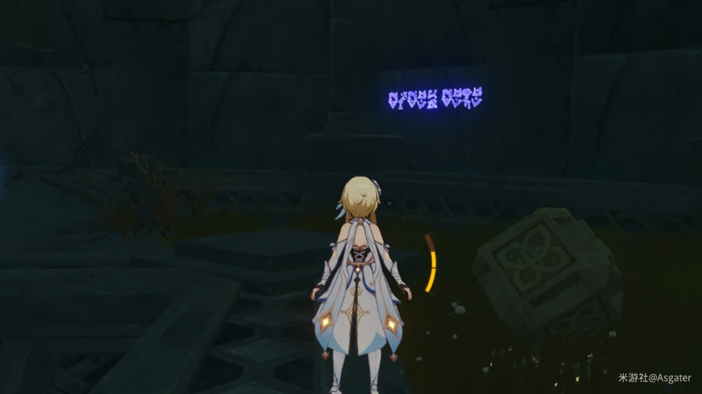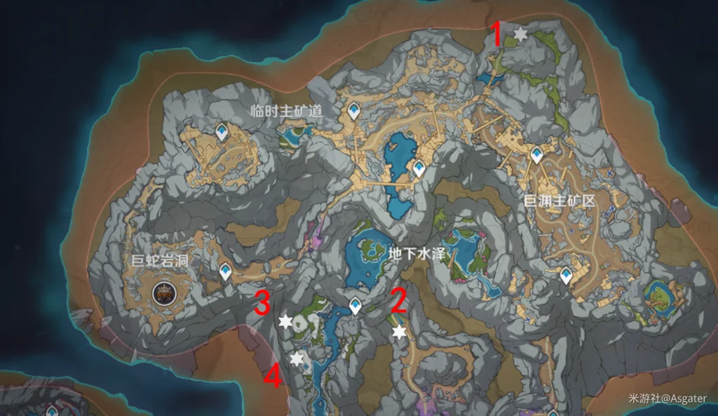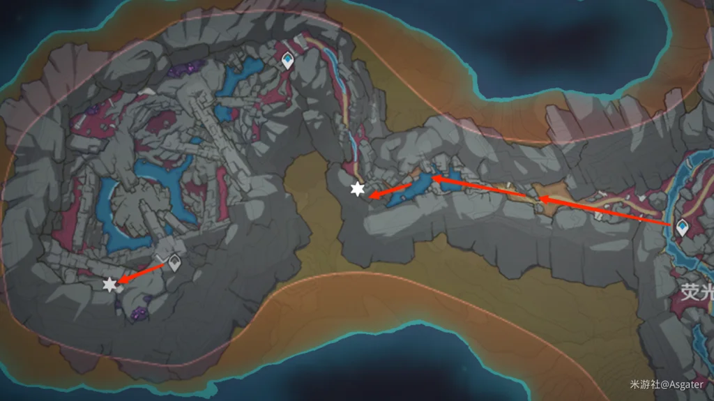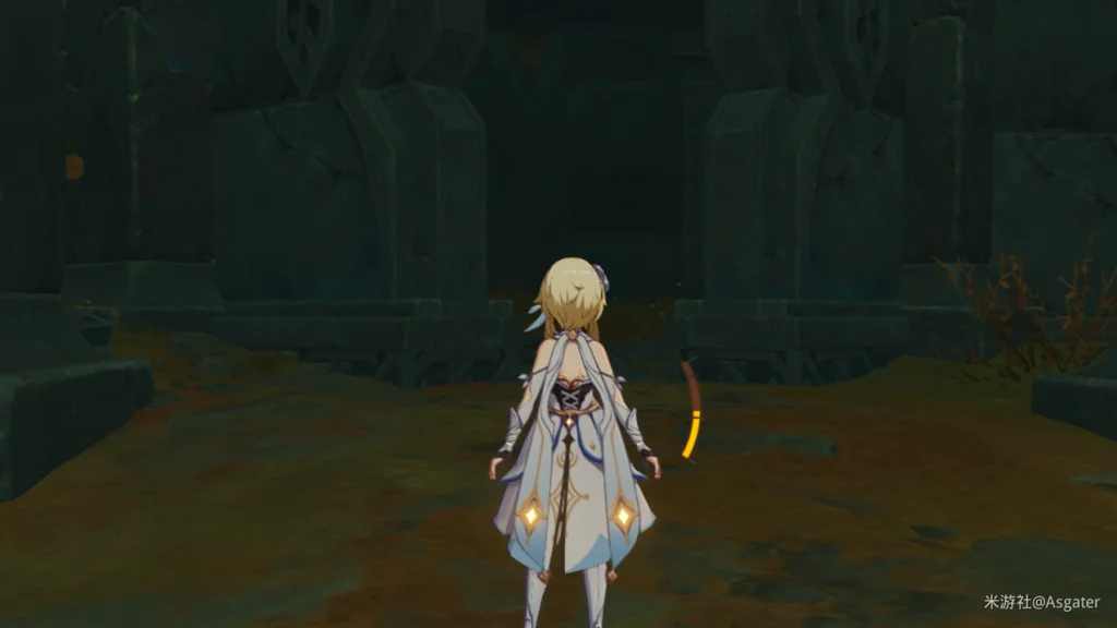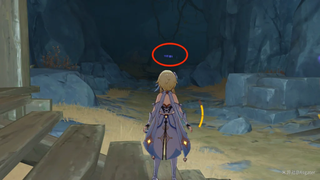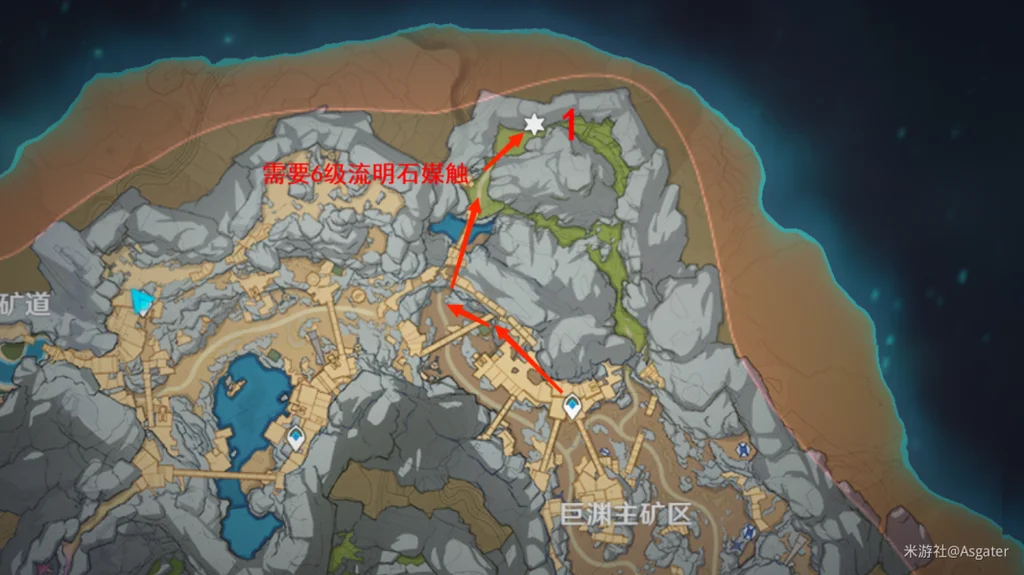 从巨渊主矿区西北侧的锚点出发,然后朝地面上的洞口处前进(如下实景图),在一处屏障后(需要6级流明石媒触)