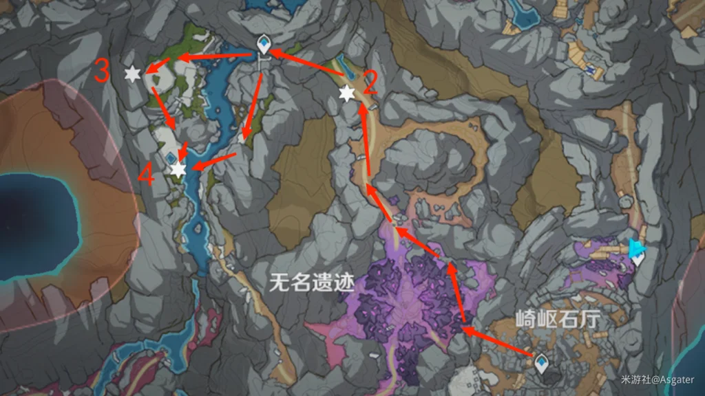 5号:从崎岖石厅处的锚点左下方的山洞进入,行进一段距离便可以在遗迹废墟上看到(如下图)