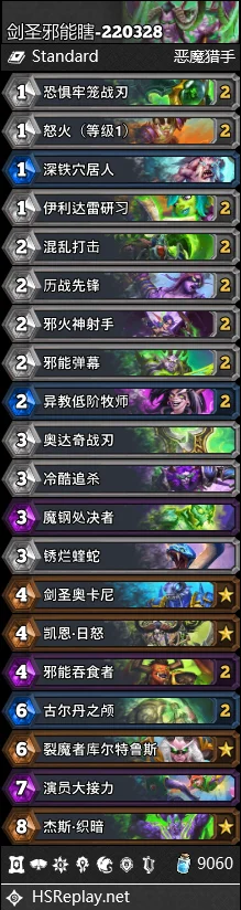 剑圣邪能瞎,我直播时打了9-6,其实就是邪能瞎的框架里装上了剑圣,蛇软是打骑士,冷酷追杀是打巴林达或卡扎库杉的,凯恩日怒是过7个吵吵的
