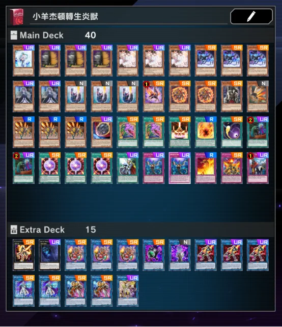 转生炎兽是一个资源循环,高安定感的卡组,拥有本家阻抗和反击,在更新访问的补强之后拥有了出色的最终清场加终结游戏的能力。它有一定的系统浓度的同时,关键卡片的功能性特色鲜明,这些是转生炎兽卡组本身的特点。