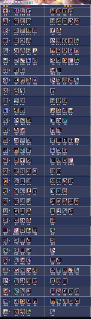 图中第一列是比较常见的上路英雄选择,第二、第三列分别是该英雄克制/被克制的单位。