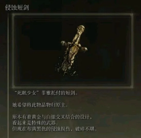 可以确定的是侵蚀短剑来自D的弟弟。在哪捡的、怎么到菲雅手里都没说清楚。比如,可能是D的弟弟用它从死王子身上取下百足环,所以被侵蚀,然后菲雅在死王子处捡到了。但这只是脑补,游戏内并没说明。