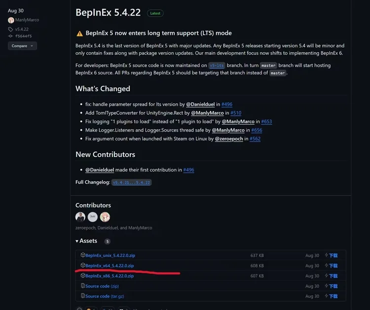 4. 分别下载BepInEx_x64_5.4.22.0.zip、XUnity.AutoTranslator-BepInEx-5.3.0.zip、TMP_Font_AssetBundles.zip备用