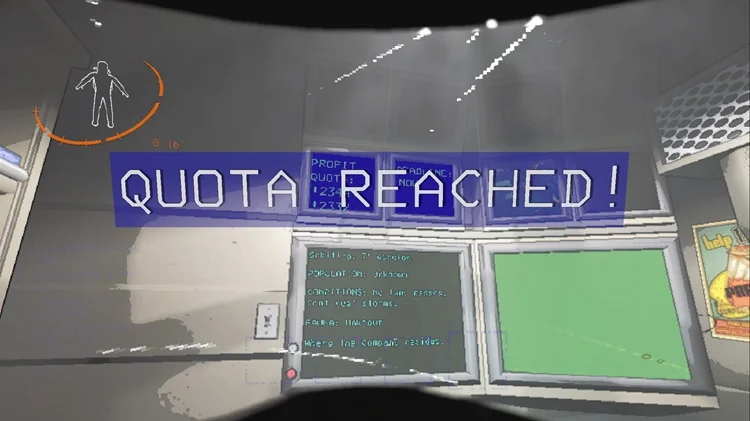 游戏指标监视器:抬头看,左侧分数是已出售的指标/右侧是所需满足指标;旁边天数则是当前剩馀天数,当天数为 0 时仍可前往公司,但如果天数为 0 时,还未满足指标的话则游戏结束,所有玩家会被当作垃圾排出太空,而如果在游玩中所有玩家在探索中死去,飞船会直接撤离,同时船舱内的所有战利品会消失,建议后期避免该情况出现至少留一个人在船上,建议在晚上之前起飞。每次结案也不要过度销售捡来的战利品,要为下一个配额节省一定的量(现金流周转)。