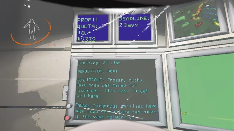 游戏设定在有限的时间内(最多 3 天),让玩家自主选择探索废弃卫星的"设施",寻找有价值的物品,玩家除了需要规划每天的行动以收集满足指标的物件价值外,还需要注意此时的卫星正值什么样的天气,细节都会影响你搜索的顺利程度,并在最后的第 0 天前往公司大楼(The Company Building)贩售物品,有个关键需要注意:儘管在旅途中返回公司不会扣减天数也可以贩售物品,但是只有在第 0 天贩售物品时可以获得 100% 的价值。仅在这天贩售物件可获得 100% 价值,假设在剩馀 1 天的阶段就跑去公司贩售,那么这些商品价值只会来到 77%。换句话说,越早去贩售物品越划亏,同时也可以时时留意电脑商店(Store)特价活动,有时商品会打折,折扣额度类似于STEAM特卖。