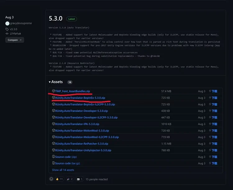 4. 分别下载BepInEx_x64_5.4.22.0.zip、XUnity.AutoTranslator-BepInEx-5.3.0.zip、TMP_Font_AssetBundles.zip备用