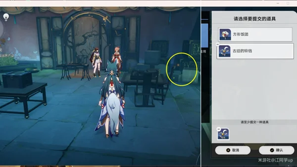 (12)上图提交【古旧的铃铛】后,旁边地上会出现1个小的箱子,然后【调查】这个小箱子后,提交【方形饭团】