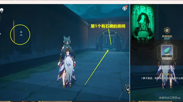 (3)进入副本后,先左边墙上【调查】2次后,可获得【异色的磁铁石】,然后进去前面【第1个有石碑的房间】 ,这个房间后面还需要返回来解密,所以大家提前知道后,有个印象就行