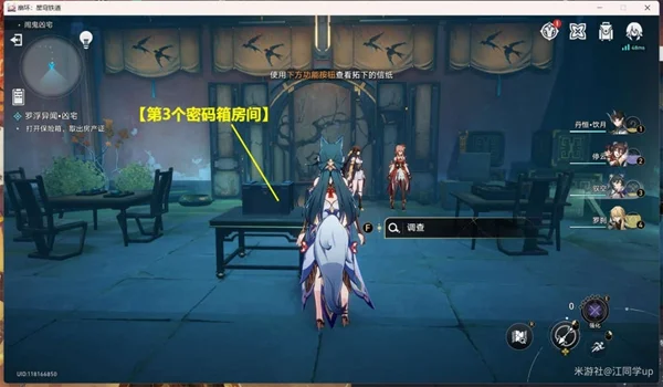 (11)到下图【第3个有密码箱的房间】后,先【调查】右上角地上的箱子,然后提交【古旧的铃铛】
