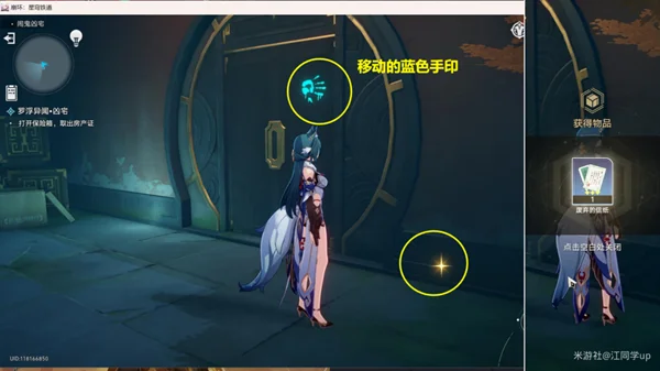(13)上图提交【方形饭团】后,旁边墙上会出现【不断移动的蓝色手印】,然后来到下图墙底下位置,调查一下【发光点】后,可获得【废弃的信纸】