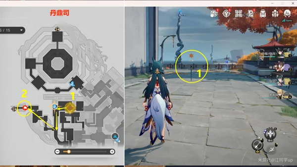 (2)然后来到【丹鼎司】下图位置,跟着1任务点的【剑】去2任务点打完【彦卿】