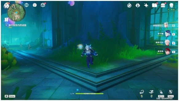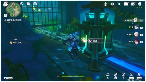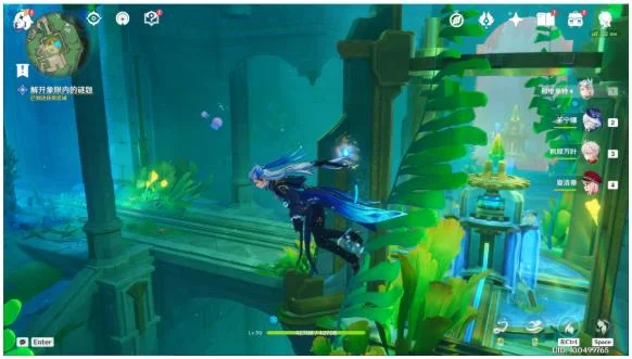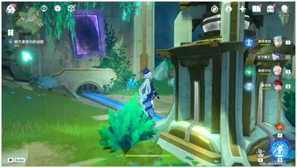 3.接着放流:这里的水道是连接好了的,不用调整。在水道的尽头找打另一个可升降的放流机关,交互“上行”前往上层后放流。就这样我们从入口开始一路引水道任务标圈区域,这样四条水道中的一条就算连接好了。