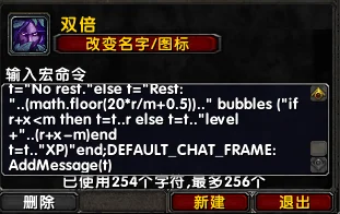 2、在命令中输入/script p="player";x=UnitXP(p);m=UnitXPMax(p);r=GetXPExhaustion();if -1==(r or -1)then t="No rest."else t="Rest: "..(math.floor(20*r/m+0.5)).." bubbles ("if r+x