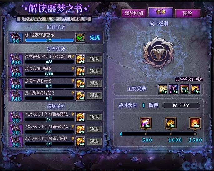 通过噩梦回廊完成任务,可以获得硬币以及战斗级别经验,提升经验获得奖励。