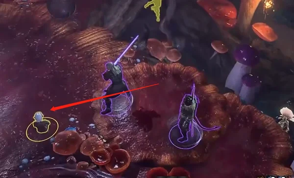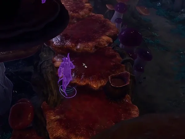 2、当玩家来到覃人栖息地中的这个位置的时候,可以看到这个大蘑菇铺成的道路,玩家从这个路前往平台。