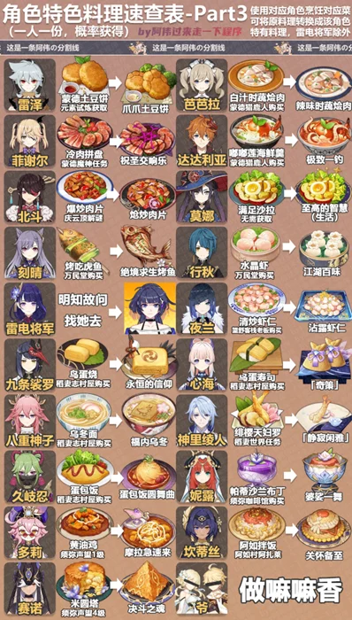 1.获得该角色,在烹饪指定料理时选择此角色进行烹饪,完成烹饪后有概率(约10%,甚至更低)获得该角色的特色料理。