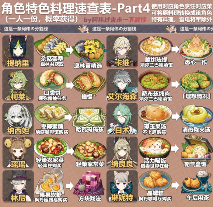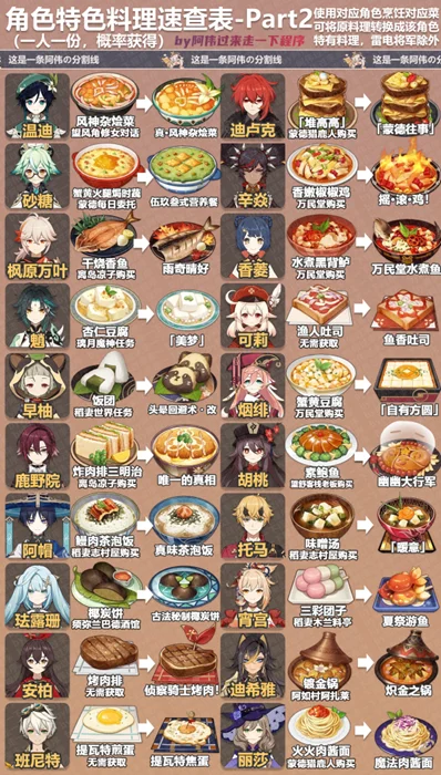 原神4.0全角色特殊料理对照查询表。不少玩家可能还不太清楚4.0版本全部角色的特殊料理,下面带来具体的查询表,供各位玩家们参考。