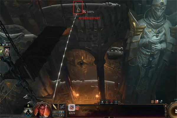 2、在前往被遗弃避难所后,玩家需要一路向前走在经过一座铁桥时利用弓箭向左手边雕像之间的操控杆进行射击,在命中了开关后就可以将吊桥放下继续向前了。