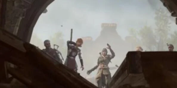 2、在目标位置,我们可以看到着火的住宅,靠近之后和其他NPC一起推开大门。