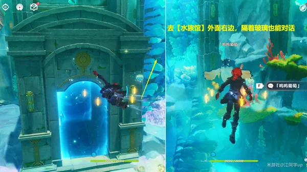 (1)第3次任务过来后,【呜呜葡萄】会躲在【水族馆】石柱后面这里,对完话后出【水族馆】