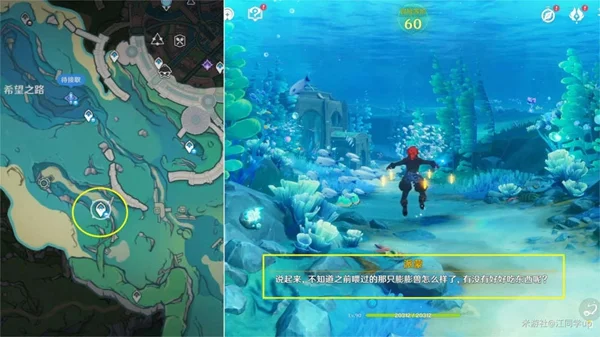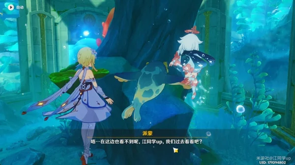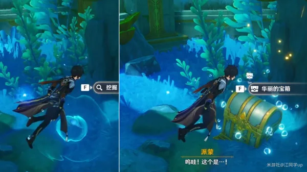 (2)最后会有派蒙提示,让我们回去【水族馆】里面,我们进来后,在石柱下海螺处【挖掘】后,即可获得1个华丽宝箱,开箱后获得隐藏成就《圆滚滚的创化论》,这个任务还挺有意思的