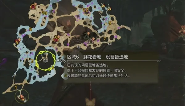 1、我们首先前往绯红森林的区域6鲜花岩地的备选设营地。