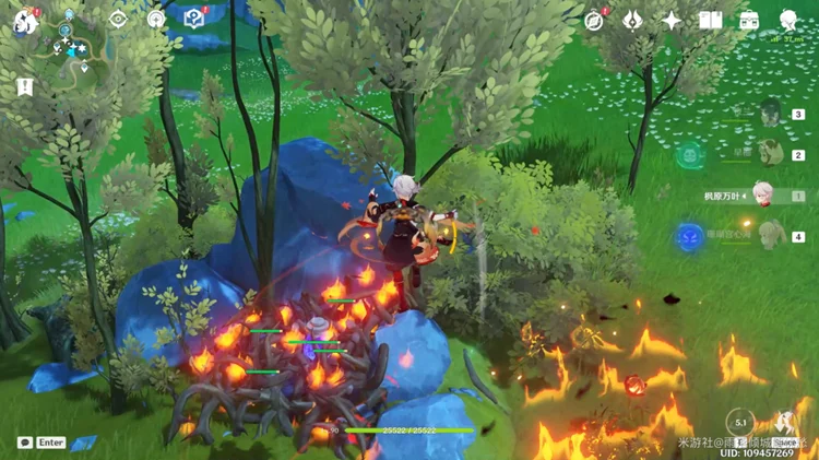 1、使用火元素角色烧掉藤蔓,或者使用风元素角色扩散旁边的烈焰花