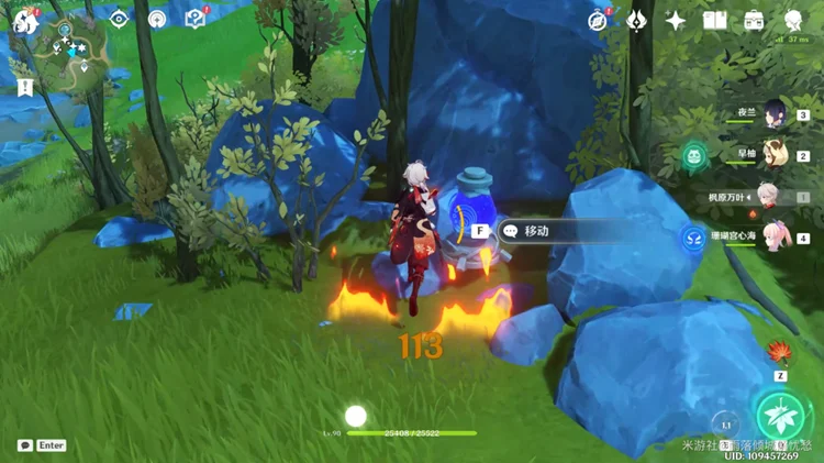 接下来打碎水琥珀,等待「水种子」出现,站在水里面等待几秒或者用水元素角色放技能,增加「水种子」,三个「水种子」可转变成『水之核』,将『水之核』放在火把旁边可熄灭火把。