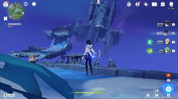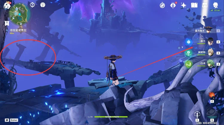 5.来到一片未知区域,和派蒙对话后前往寻找夏诺蒂拉:在这片区域浮空的废墟上有很多挑战/解密/宝箱,后续可以重新回来探索,这里我们先直接跟着任务走。