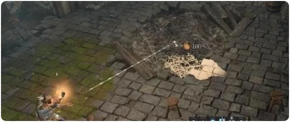 3、找到被蛛网覆盖安全通道后,操纵人物角色应用专业技能【火焰箭】将蛛网损坏,进而开启通向【别墅地下室】通道。