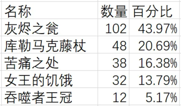可以看到,吞噬者王冠这个暗金装备的掉率是最低的,基本上只有5.17%。另外部门首领掉落隐秘传奇的几率也非常小,大概几率只有3.69%。