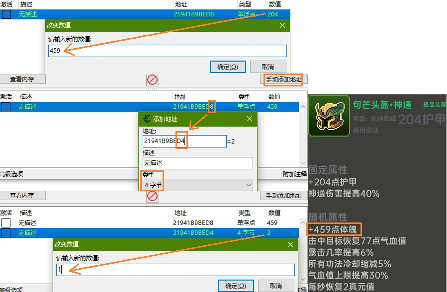 第八步:对属性值进行修改(例如:将+204点气力修改为+459点体魄)。先将204改成459,再‘手动添加地址’去修改属性类型为体魄,添加的地址是原地址减4,类型是4字节,看到它的值是2(2代表气力),将2改成1(1代表体魄),就改好了。